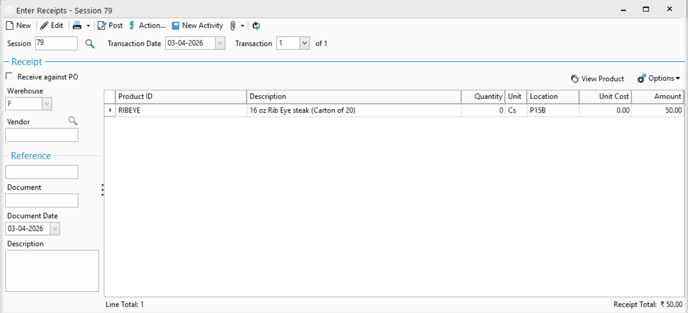 - Click new in the left hand corner and if needed, adjust the session date and warehouse at right. Added costs will be added as of the session date