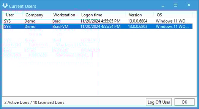 NOTE: It is strongly recommended that you ask users to log out themselves so that they have an opportunity to save their work. Once you forcefully log off a user, they will receive a notification within one minute of the request and their only option will be to close Acctivate.